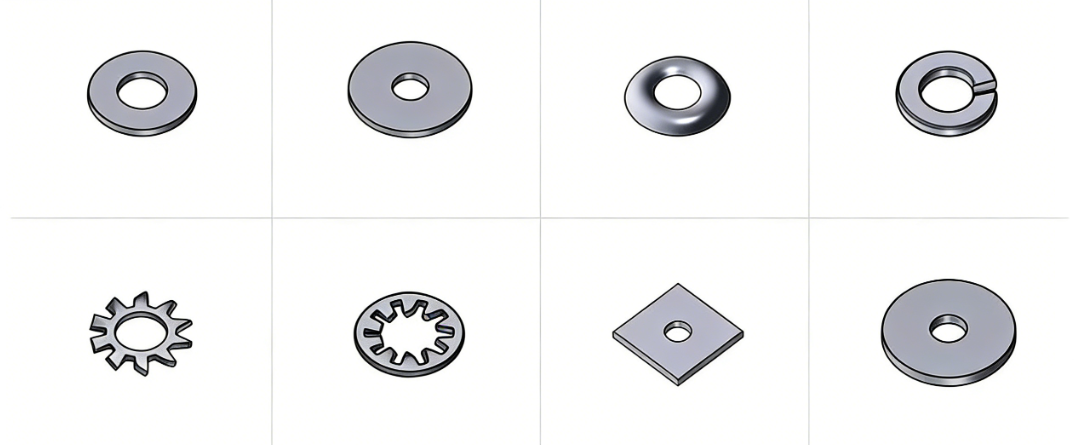 ④ Ciertas arandelas cuentan con diseños especializados para evitar que las tuercas se aflojen. Comúnmente conocidas como arandelas de seguridad, vienen en varias configuraciones: ranuradas, en forma de estrella, en forma de onda y más. Estas arandelas de seguridad deben usarse junto con tuercas.